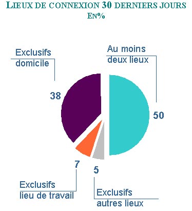 Illustration d'une utilisation en tous lieux : 50% des internautes se sont connectés au web au cours des 30 derniers jours depuis au moins de deux lieux et même 11% depuis au moins trois lieux.