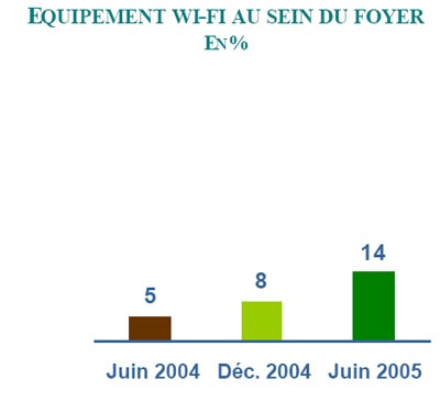 La progression des équipements Wifi au sein du foyer symbolise la souplesse dont disposent les individus pour se connecter au web.14% des internautes disposent d'un accès Wifi au sein de leur foyer, soit 3 fois plus qu'en juin 2004.Par rapport à l'ensemble des internautes, les équipés Wifi sont caractérisés par un habitat francilien (35% vs 26%), un niveau de vie élevé (CSP+ : 51% vs 44%), une grande expérience du web (utilisateurs depuis plus de 5 ans : 39% vs 27%).