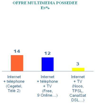 La connexion au web est désormais intégrée dans des formules double play ou triple play. Ainsi, Plus d'un ¼ des internautes accèdent au web via une offre packagée combinant un abonnement de téléphonie et/ou de télévision.La formule Internet / Téléphone est actuellement choisie par 14% des internautes et 12% possèdent un abonnement Web/Téléphone /TV.Côté intention d'équipement, encore16% des internautes déclarent vouloir accéder à Internet via l'une de ces trois offres au cours des douze prochains mois.