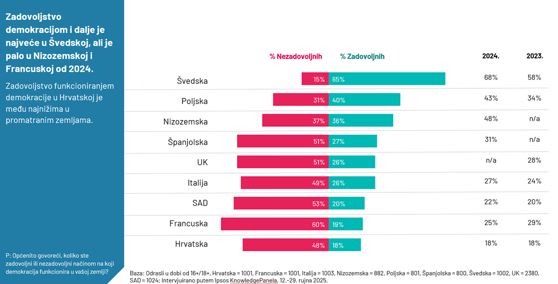 Istraživanje ukazuje na sveprisutan osjećaj nezadovoljstva praktičnim funkcioniranjem demokracije u mnogim zemljama. Oko polovice ili više ispitanika u Španjolskoj, UK-u, Italiji, Francuskoj, Hrvatskoj i SAD-u izražava nezadovoljstvo načinom na koji demokracija funkcionira u njihovoj zemlji. Posebno su negativni pogledi u Francuskoj (19% zadovoljnih), gdje je zadovoljstvo palo za 6 postotnih bodova u odnosu na 2024. godinu, te u Nizozemskoj (36% zadovoljnih), gdje je zabilježen pad od 12 postotnih bodova. Hrvatska je među zemljama s najnižim zadovoljstvom, sa samo 18% zadovoljnih. Švedska je jedina zemlja u kojoj je većina (65%) zadovoljna funkcioniranjem demokracije.