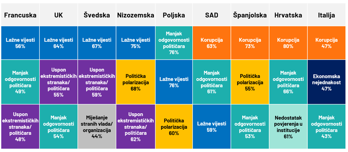 Građani su itekako svjesni izazova s kojima se demokracija suočava. Širenje dezinformacija i "lažnih vijesti" identificirano je kao glavna prijetnja u nekoliko sjevernoeuropskih zemalja, dok je korupcija primarna briga u južnoj Europi i Sjedinjenim Državama. U Hrvatskoj je korupcija percipirana kao najveća prijetnja (80%), što je najviši postotak među svim promatranim zemljama.