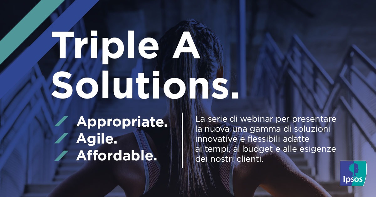 Ipsos ha organizzato una nuova serie di webinar per presentare le Triple A Solutions: Appropriate. Agile. Affordable, una gamma di soluzioni innovative e flessibili adatte ai tempi, al budget e alle esigenze dei nostri clienti.