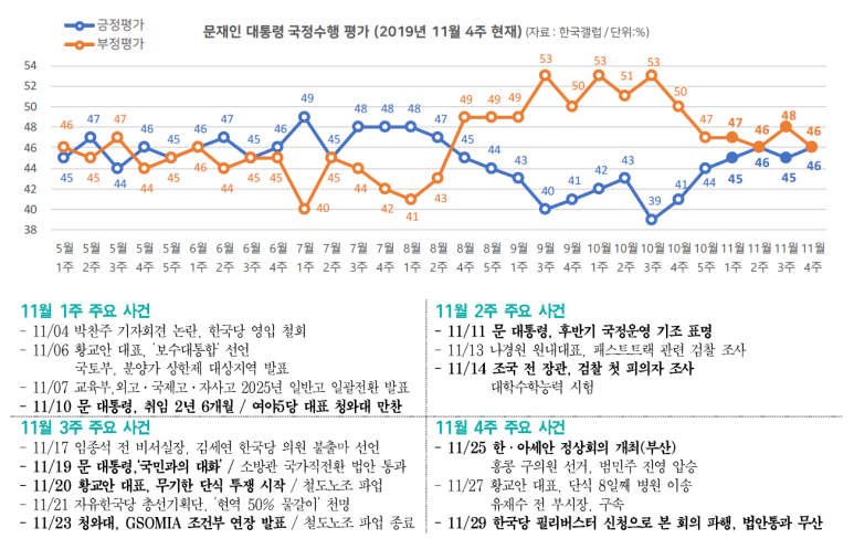 - 11월 4주 현재 국정수행 긍정평가율은 45%를 기록함(자료 : 한국갤럽)
