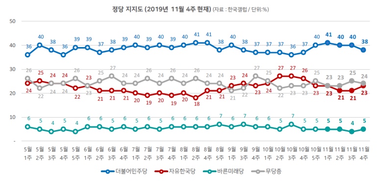 ❍ 11월 정당지지도를 살펴보면 ‘조국 이슈’에서 벗어난 더불어민주당이 상승세를 보이다 잠시 주춤함(11월 4주차 지지도 38%, 자료 : 한국갤럽)