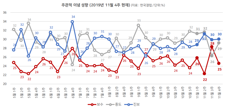 - 11월 말 현재 주관적 진보층 규모는 30%를 기록함(자료 : 한국갤럽)