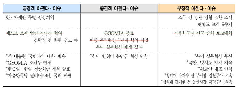 ❍ 긍정적 아젠다․이슈 중 현실화 된 것은 한․아세한 특별 정상회의가 유일했고, 추가적으로 문 대통령의 ‘국민과의 대화’ 방송, GSOMIA 조건부 연장 및 한중일․한일 정상회담 개최, 자유한국당 필리버스터 등이 일부 영향을 미침