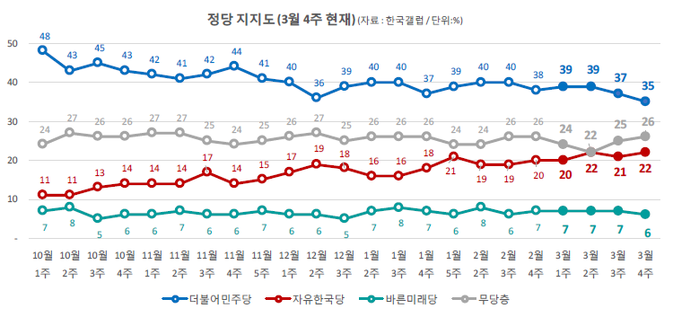 국정지지도와 긴밀히 연동되어 있는 민주당 정당지지도도 하락세를 보이면서 35%로 3월을 마감하였다.