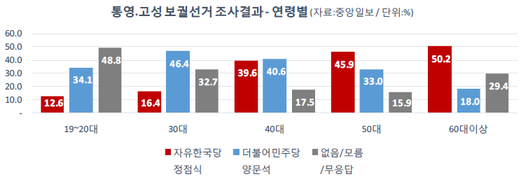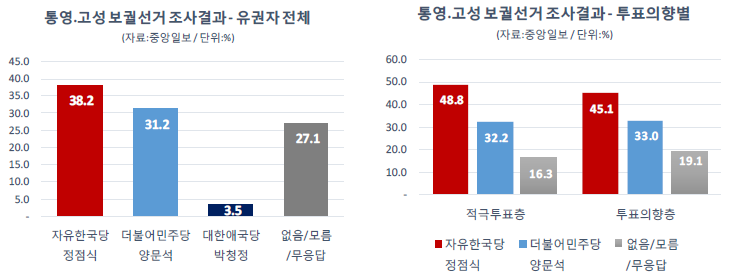 통영․고성 보궐선거는 자유한국당 정점식 후보 38.2% vs 더불어민주당 양문석 후보 31.2%로 정점식 후보가 앞서고 있는 것으로 나타났다. (중앙일보 3월 24일~25일 조사 결과) 반드시 투표하겠다는 ‘적극투표층’에서는 격차가 벌어져 자유한국당 정점식 후보 48.8% vs 더불어민주당 양문석 32.2%로 나타나, 투표의향층에서도 정점식 후보가 앞서고 있어 여론조사 상으로는 정점식 후보의 당선 가능성이 높아 보인다.