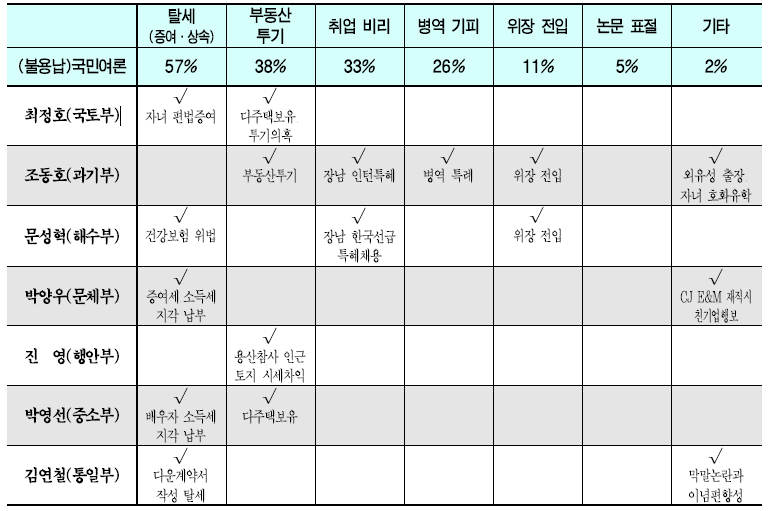 이는 오히려 문재인 대통령 및 청와대에 대한 국민적 신뢰를 더욱 떨어뜨리는 악재로 작용했다고 분석된다. 장관 후보자 7명 모두 탈세․부동산 투기․위장 전입 등 각종 의혹이 제기되었으며, 한국갤럽이 3월 4주차에 조사한 ‘고위공직자 관련 의혹 중 가장 용납할 수 없는 것(복수 응답)’을 후보자별 의혹과 비교하면 아래 표와 같다