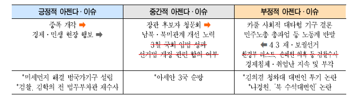 남북․북미관계 개선 노력은 청와대와 정부의 다양한 물밑 노력에도 불구하고 성과가 없었으며, 3월 국회 입법 성과와 선거법 개정 관련 합의는 내용에 따라 긍정 또는 부정적 영향을 미칠 것으로 전망되었으나 진전이 없어 소멸되다시피 하였다.