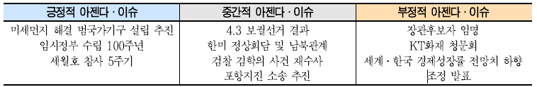부정적 아젠다․이슈는 3월 내내 논란이었던 장관후보자 임명과 이에 따른 여야 대립이 중심으로, 세계․한국 경제성장률 전망치가 하향 조정 발표되는 것도 여권에게 부정적 영향을 미칠 것으로 보인다.