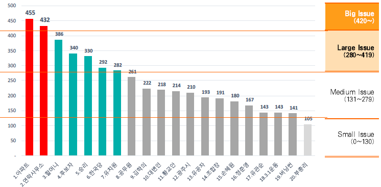 프로야구 개막에 따른 ‘개막전’ 키워드와 북한의 연락사무소 철수 관련 키워드가 Big Issue로 나타났으며, Large Issue로는 드라마 키워드들이 많은 가운데(와이키키, 그녀석, 조들호) 승리에 대한 관심도 여전히 높게 나타났다. 또한 장관 후보자에 대한 국민적 관심도 높아 Large Issue에 올랐다.