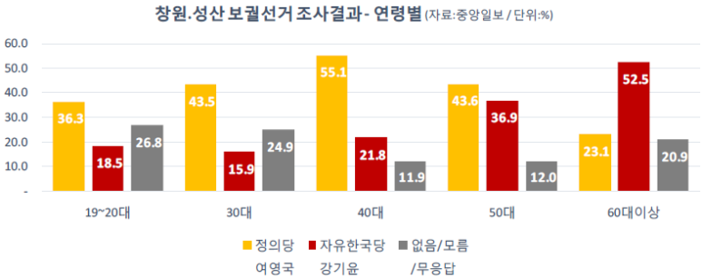 적극투표층과 투표의향층 모두에서 여영국 후보가 앞서는 이유는 연령별 지지현황에서 나타난다. 정의당 여영국 후보는 20․30대는 물론 40대와 50대에서도 앞서고 있고, 자유한국당 강기윤 후보는 60대 이상에서만 앞서, 연령별 투표율 차이 때문에 발생하는 투표율 변수가 사라지게 됨