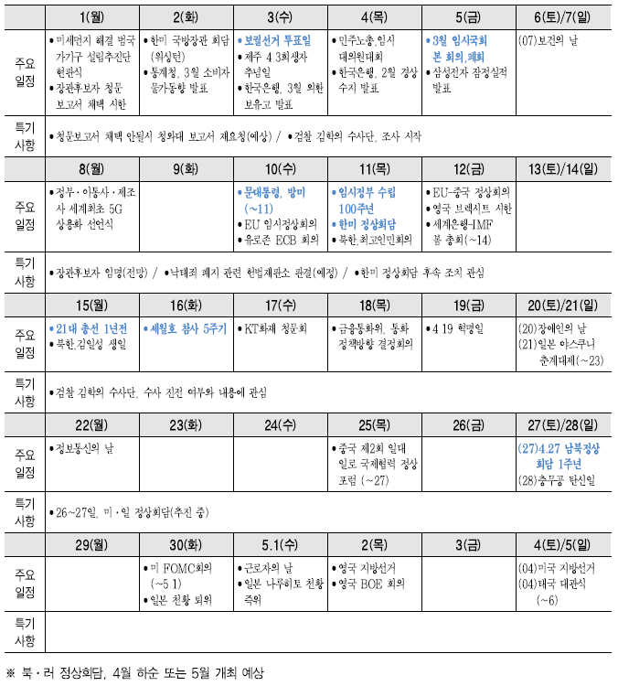 4월은 대외변수가 별다른 영향력이 없으면서 국내 아젠다․이슈가 전면에 부각될 것으로 전망된다. 문재인 대통령의 국정지지도 하락과 자유한국당의 정당지지도 회복이 겹치면서 모든 방면에 걸쳐 과거 정부 책임론 vs 현 정부 책임론이 부딪히는 등 여야 갈등이 심화될 것으로 보인다.