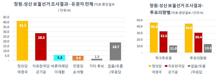 먼저 창원․성산 보궐선거 현황을 살펴보면 더불어민주당과 후보단일화에 성공한 정의당 여영국 후보가 앞서고 있는 것으로 나타났으며, 선거결과 역시 여영국 후보가 승리할 가능성이 높은 것으로 보인다. 중앙일보가 3월 25일~26일 조사한 결과에 따르면 정의당 여영국 후보 41.3% vs 자유한국당 강기윤 후보 28.5%로 여영국 후보가 우세하였다. 반드시 투표하겠다는 ‘적극투표층’, 적극투표층에 가급적 투표하겠다는 유권자까지 포함한 ‘투표의향층’ 모두에서 여영국 후보가 앞서고 있어 투표율 변수가 옅어지면서 조사 결과대로 여영국 후보의 당선 가능성이 높아졌다.