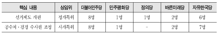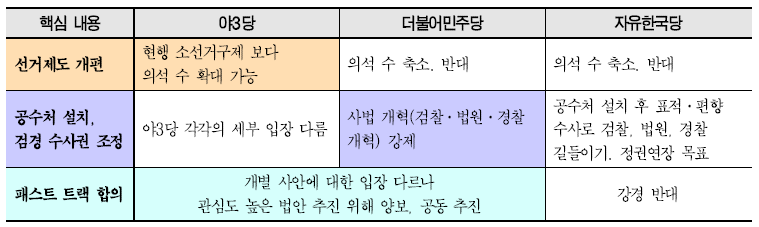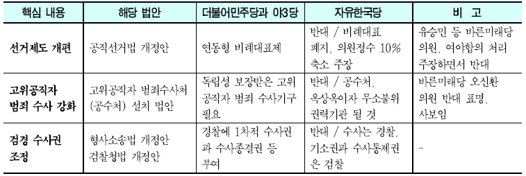 실제로는 법안 자체에 대한 찬성/반대 이유보다 법안 추진에 담긴 정치적 이해관계가 첨예하게 갈리면서 전면전을 벌이고 있는 것으로 분석된다. 더불어민주당과 자유한국당간의 싸움에서 중요한 것은 선거제도 개편이 아니라 사법제도 개편으로, 청와대와 민주당은 공수처 설치를 통해 검찰․법원․경찰개혁을 제도적으로 추진하겠다는 생각이 강하다.
