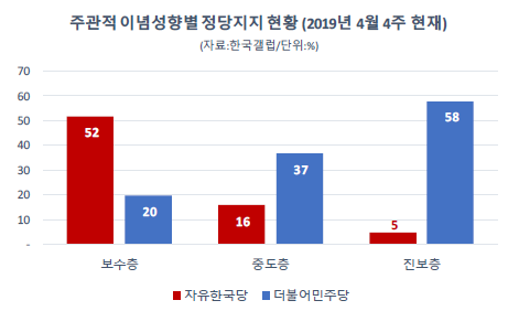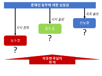 현재 자유한국당의 정당지지율을 자세히 살펴보면 보수층 중 52%만 지지를 하고 있고, 중도층에서도 16%의 지지 밖에 얻지 못하고 있으며,(갤럽 4월 4주차 조사결과) 더불어민주당은 보수층 중 20%, 중도층 중에서는 37%의 지지를 얻고 있어 자유한국당이 강경 보수층 결집에는 성공하고 있지만 합리적 보수층을 흡수하지 못하고 있는 것으로 볼 수 있다.