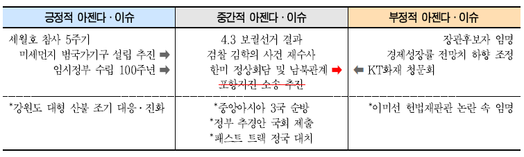 전반적으로 긍정적 아젠다․이슈들이 국민적 관심사들로 구성되어 있어 여권이 이들 아젠다를 효과적으로 부각할 경우 국정운영에 긍정적 영향을 미칠 것으로 예상되었다. 그러나 이전 국정운영 방식과 마찬가지로 남북․북미관계 외의 국정 아젠다는 1/n 로 처리되면서 대통령 메시지․행보는 일회성에 그치고 국정 아젠다는 부각되지 못한 것으로 보인다. 문재인 대통령이 장자연 사건, 미세먼지, 세월호, 5G 상용화 등 다양한 아젠다․이슈에 대해 메시지를 내놓았지만, 너무 다양한 아젠다․이슈를 다루다 보니 국정 아젠다로서 뚜렷하게 부각된 것은 없다는 분석이다. 이러한 이유로 미세먼지 범국가기구 설립 추진, 임시정부 수립 100주년은 긍정적 영향을 미치지 못하였다.