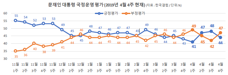 문재인 대통령의 국정운영 지지도는 4월 1주차에 41%까지 하락, 취임 이후 최저치를 기록하였으며 이후 곧바로 반등에 성공해 4월 3주차에는 48%까지 상승했으나 44%로 하락하며 4월을 마무리 하였다.