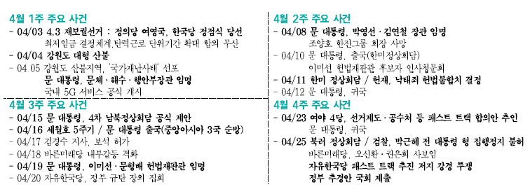 4월의 주요 아젠다․이슈를 국정운영에 미치는 영향력별로 분류한 것과 실 결과는 아래와 같다.