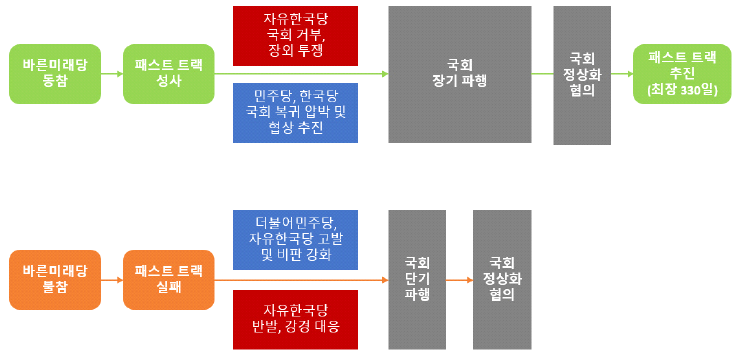 패스트 트랙 추진 관련 흐름을 시나리오별로 살펴보면 아래 그림과 같으며, 패스트 트랙 성사/실패의 키를 쥐고 있는 정당은 바른미래당이며, 어떠한 경우에도 국회 파행은 불가피한 것으로 보인다.