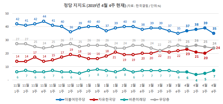 더불어민주당 정당지지도 역시 문재인 대통령 국정지지도와 마찬가지로 4월 3주까지 상승세를 보였으나, 4월 4주에 하락세를 보이면서 한 달을 마감하였다. 4월 4주 현재 35%를 기록하고 있으며, 이는 한 달 전인 3월 3주와 같은 지지율이다.