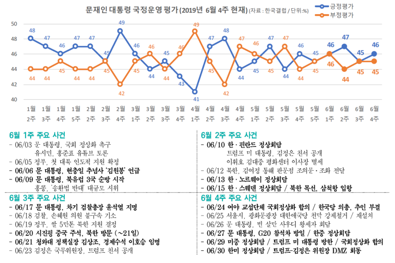 - 6월은 혼전양상을 보이는 가운데 긍정평가가 소폭 우세하면서 마무리 됨(한국갤럽 조사결과)