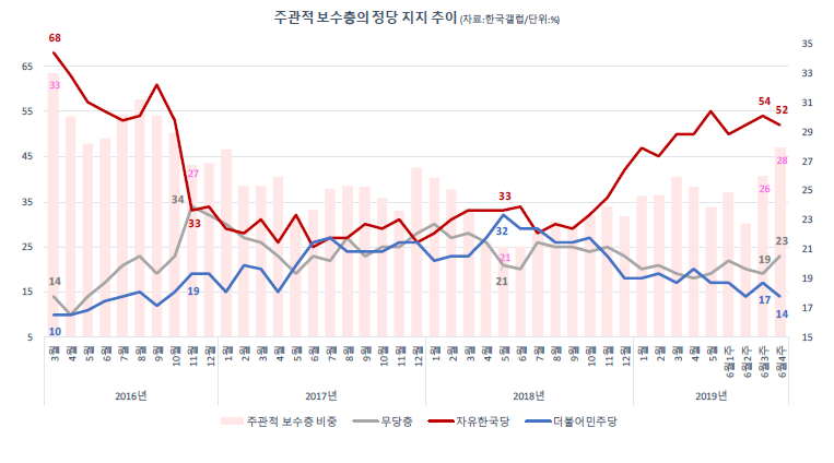 - 양적으로 보수층이 늘어난 것은 이른 바 합리적 성향의 보수층이 문재인 정부에 실망하면서 회귀한 것인데, 자유한국당은 이들을 미처 흡수하지 못하고 있는 것임