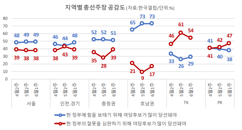- 여당은 서울, 인천.경기, 충청권, 호남권에서 우위를 보이고,