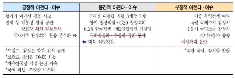 - 6월 30일에 DMZ에서 진행된 트럼프-김정은 회동은 7월 국정운영에 긍정적 영향을 미칠 것으로 전망됨