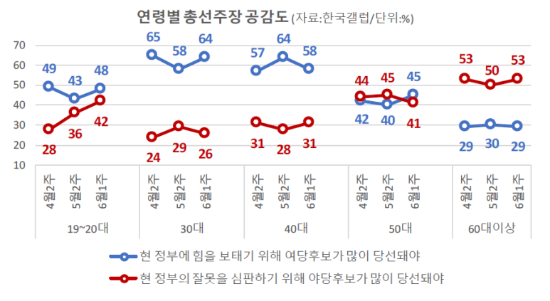 - 내년 총선과 관련해 ‘현 정부에 힘을 보태기 위해 여당후보가 많이 당선돼야 한다’는 주장에 대한 공감도는 47%이고, ‘현 정부의 잘못을 심판하기 위해 야당후보가 많이 당선돼야 한다’는 주장에 대한 공감도는 40%를 기록함