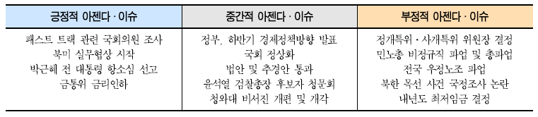 - 특히 굵직한 이슈들이 대부분 중간적, 부정적 영역에 속해 있어 더욱 여권의 정치력에 관심이 집중되고 있음