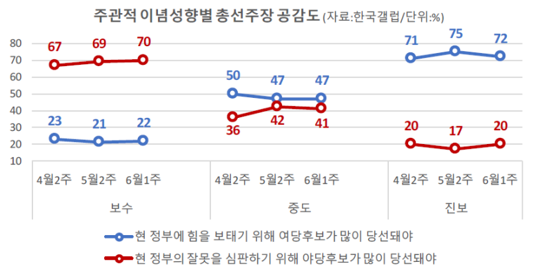 - ‘좌파 독재 저지’ 등 이념 공세와 장외투쟁에 대해 보수층 중 상당수가 동의하지 않는 것으로 보임