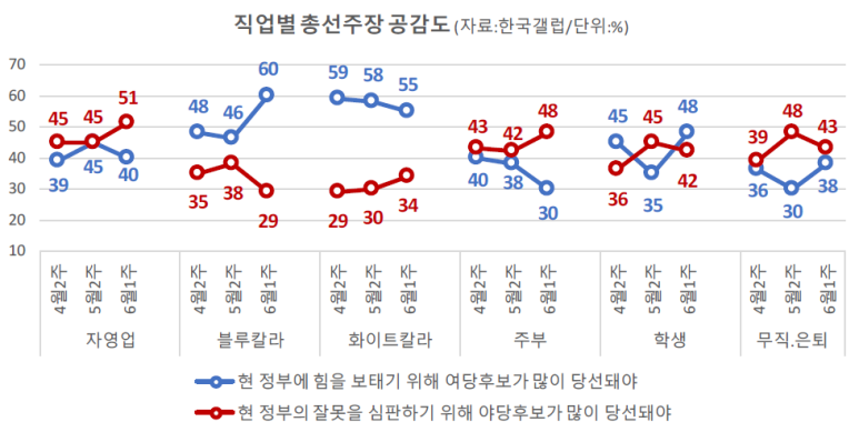 ※ 총선주장에 대한 공감도가 엇갈리고 있는 학생 계층의 향후 흐름도 주목됨