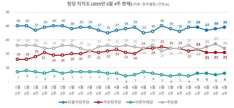 - 황교안 대표 등장을 계기로 상승세를 보이던 자유한국당은 하락세로 돌아섰으며, 1월 5주와 동일한 21%의 정당지지율을 기록하며 6월을 마감함(한국갤럽 조사결과)