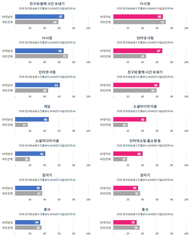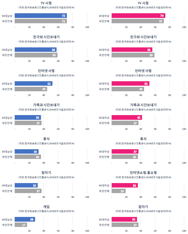 20대와 거의 비슷하게 남녀 모두 평일 여가활동 상위 3가지는 TV 시청, 친구 만남, 인터넷 서핑으로 나타났다.