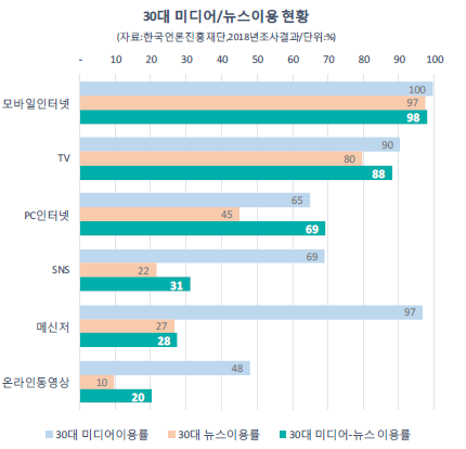 미디어 이용률과 뉴스 이용률을 종합한 미디어-뉴스 이용률은 모바일 인터넷이 가장 높고 TV, PC 인터넷 순으로 역시 20대와 동일해 미디어/뉴스 이용 현황만 놓고 보면 20대와 30대는 동일한 세대로 볼 수 있다.