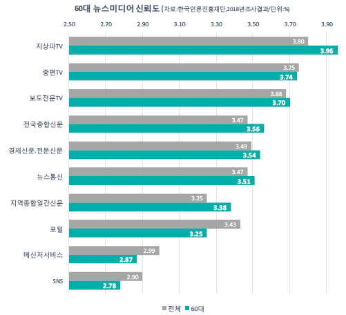 60대는 TV 친화적인 세대임에도 불구하고 50대 다른 미디어 신뢰도를 보이고 있다. 지상파TV는 가장 신뢰하고 있지만 종편TV에 대해서는 국민전체보다 낮은 신뢰도를 보이며, 보도전문TV에 대한 신뢰도 역시 국민전체에 비해 근소하게 높은 수치이다.