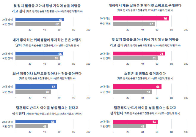 ➡ 19~20대 가치관 및 라이프스타일 : 남녀 모두 자신만의 행복 중시
