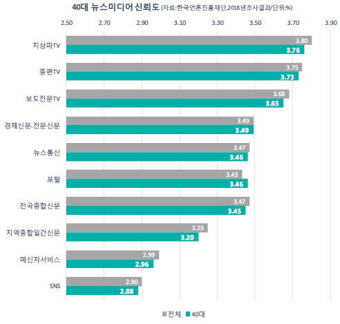 40대가 가장 신뢰하는 뉴스 미디어는 지상파TV로 나타났으나 종편TV 신뢰도와 차이가 크지 않아 40대도 종편TV에 대한 신뢰도가 높았다. 또한 20대․30대와 달리 포털 보다 경제신문․전문신문에 대한 신뢰도가 더 높게 나타났다. 40대의 경우 포털 사이트의 댓글 조작 논란 등에 대해 민감하게 반응한 것으로 분석된다.