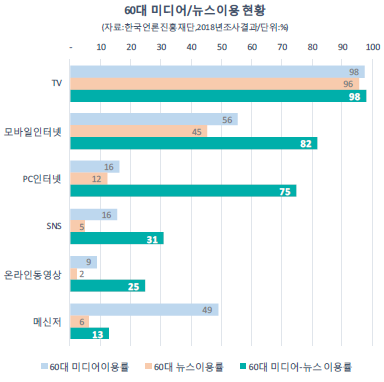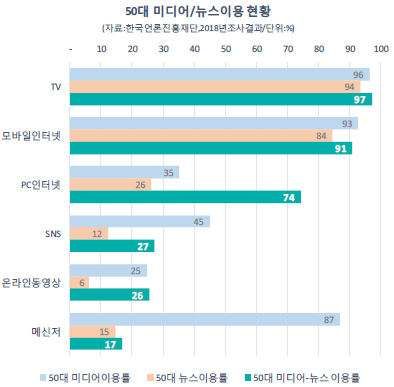 미디어 이용률과 뉴스 이용률을 종합한 미디어-뉴스 이용률 면에서는 TV가 가장 높고 다음으로 모바일 인터넷과 PC 인터넷이 뒤를 이었다. 유튜브 등 온라인 동영상 플랫폼 이용률은 20․30․40대에 비해 낮은 25%로 나타났으나 미디어-뉴스 이용률은 26%로 높게 나타났다. 이는 온라인 동영상 플랫폼 사용자 중 뉴스 이용자 비율이 높기 때문으로 최근 유튜브 뉴스/시사 프로그램 주 시청층이 50대인 것으로 분석된다.