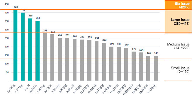 유치원은 사립유치원 처우 개선비 지원 재개 결정 및 아이돌보미 이슈가 겹쳐 관심을 받았으며, 또한 고위공무원 조사와 공무원 및 군인연금 이슈가 불거지면서 공무언 키워드도 높은 순위에 올랐으며, 승리 게이트 관련 키워드 중에서는 ‘승리’만 Large Issue에 올랐고 버닝썬, 정준영 등은 Medium Issue에 머무른 것으로 나타났다.