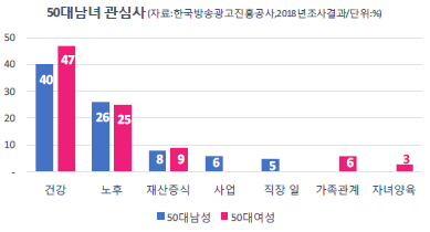 50대 남성과 여성의 가장 큰 관심사는 건강이 압도적으로 높은 가운데 노후, 재산증식 순으로 뒤를 이었다. 50대 남성은 사업과 직장 일에 대한 관심을 보이는데 비해 50대 여성은 가족 관계와 자녀양육에 대해 관심을 보였다.