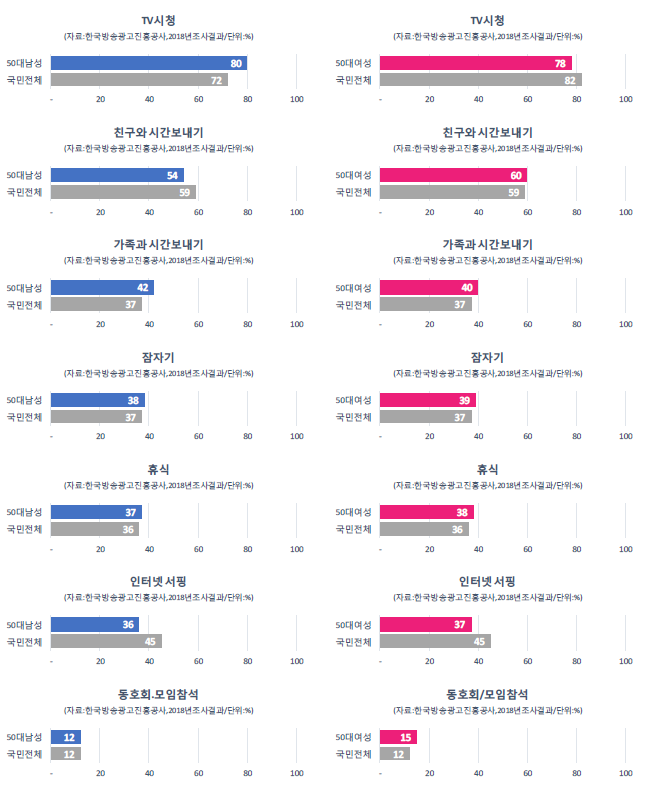 50대 평일 여가활동은 20․30․40대와 달리 인터넷 서핑 대신 가족과 시간보내기가 높은 순위에 등장하였다.