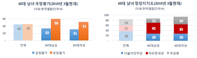 정당지지율에서는 60대 남성, 여성 모두 자유한국당을 더 많이 지지하고 있었다.