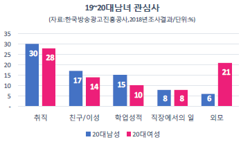 ➡19~20대 주요 관심사 : 남녀 모두 취직이 가장 큰 관심사고, 여성은 외모 관심 높아
