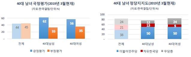 40대 남녀는 모두 국민 전체에 비해 국정운영 긍정평가율이 높고, 더불어민주당에 대한 지지율도 높았다.