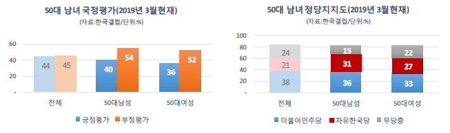 정당지지율에서는 50대 남성, 여성 모두 더불어민주당과 자유한국당 지지로 나뉘어, 더불어민주당이 우위를 보이고 있으나 20․30․40세대에 비해 상대적으로 자유한국당 지지도가 높은 수준이었다. 50대 여성 역시 20․30․40 여성과 달리 자유한국당에 비교적 우호적 태도를 보이고 있다.
