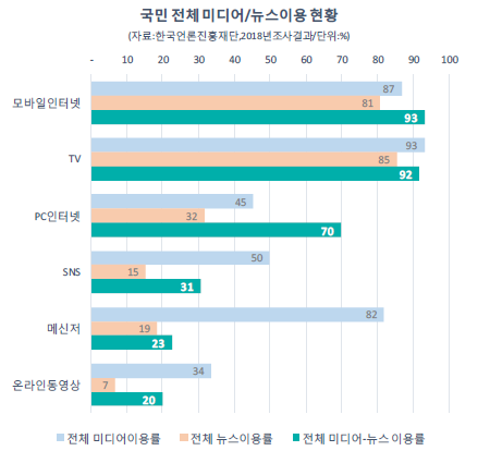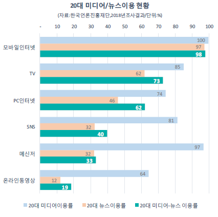 19~20대의 미디어 이용은 모바일 인터넷 비중이 가장 높고 다음으로 메신저, TV, SNS 순으로 나타났으며, 뉴스 이용은 모바일 인터넷, TV, PC 인터넷 순이었으며, 미디어 이용률과 뉴스 이용률을 종합한 미디어-뉴스 이용률은 모바일 인터넷이 가장 높고, TV, PC 인터넷 순이었다. 유튜브 등 온라인 동영상 플랫폼 이용률은 높지만 이곳에서의 뉴스 이용률은 높지 않은 것으로 나타났다.