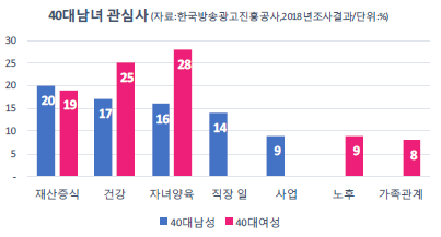 40대 남녀의 관심사는 다소 다른 것으로 나타났다. 남성은 재산증식, 건강, 자녀양육 순으로 관심을 갖고 있으며, 이에 비해 여성은 자녀양육, 건강, 재산증식 순으로 관심을 가졌다.